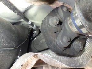 パーキングブレーキワイヤーとプロペラシャフトが、干渉しています。